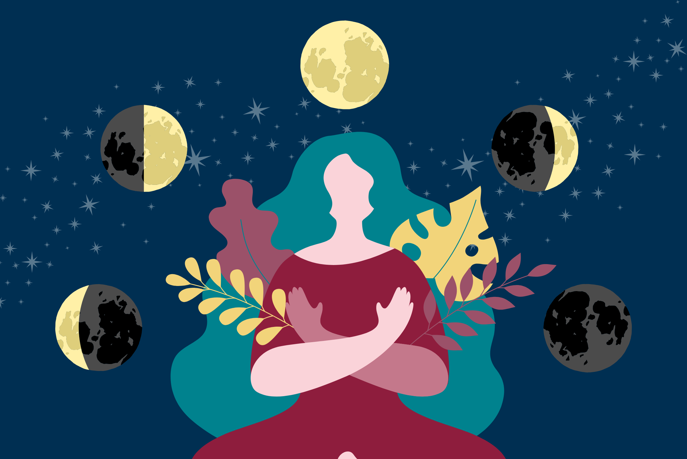 Illustration of a calm woman in a meditative state, embraced by the phases of the moon.